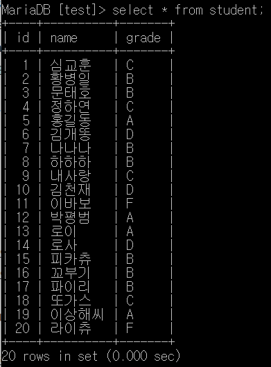 INSERT INTO student (name, grade) VALUES ('심교훈', 'C');