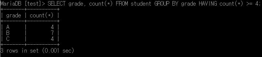 GROUP BY로 그룹화 한 결과에서 어떤 조건으로 필터링 하고 싶을 때는 HAVING을 사용합니다. 만약 4명 이상의 학생이 받은 학점만 남기고 싶다면 다음과 같이 쿼리문을 수정해주면 됩니다.