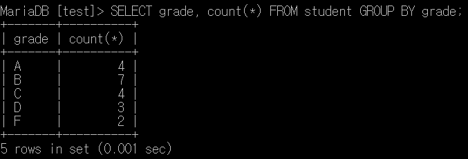 위 student 테이블에서 학점이 A, B, C, D, F인 학생이 각각 몇 명인지 알고 싶다면 group by를 활용하면 됩니다.