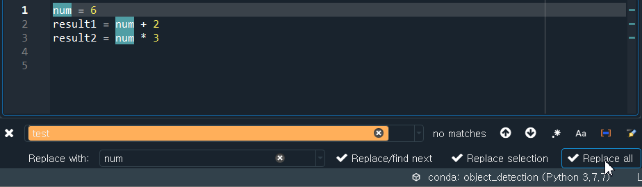 이 중 위에 있는 입력창에 수정할 문자열을 입력합니다. 그리고 Replace with 부분에는 새로운 문자열을 입력합니다. 그 다음에 Replace all 버튼을 클릭하면 다음과 같이 한번에 test가 모두 num으로 변경됩니다.
