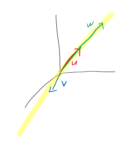 여기서 집고 넘어가야 할 점은 세 개의 벡터 모두가 서로 선형 독립(linearly independent)일 때 그렇게 된다는 것입니다. 선형 독립이라는 말은 벡터의 방향이 서로 다르다는 뜻입니다. 선형 독립이라면 두 벡터가 길이가 0인 영벡터가 아닌 이상 v와 cu는 같을 수 없습니다.