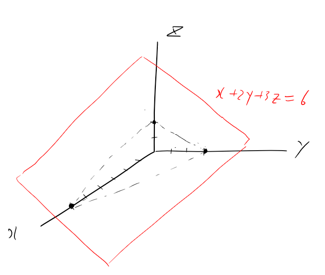 각 방정식을 그래프로 그리면 3차원 공간에서의 평면들이 됩니다. 무슨 말이냐고요? 우선 x + 2y + 3z = 6을 생각해보겠습니다. 이 친구는 일단 점 (6, 0, 0)을 지납니다. 그리고, 점 (0, 3, 0)도 지나고, 점 (0, 0, 2)도 지납니다. x, y, z 절편들을 생각해본 것입니다. 얘네들을 x, y, z 3차원 그래프에 한 번 찍어보겠습니다. 이 세 점을 모두 지나는 직선은 존재할 수 없습니다. 대신 x + 2y + 3z = 6 위에 있는 모든 점들을 찍은 것을 잇는다면 다음과 같은 하나의 평면이 보일 것입니다.