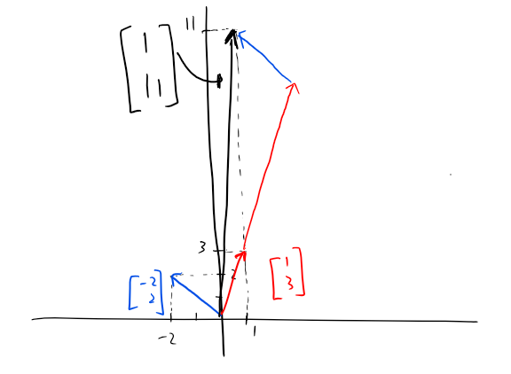 column picture로 푼다는 것은 벡터 (1, 3)과 벡터 (-2, 2)를 어떻게 선형 결합해야지 벡터 (1, 11)이 나올지를 고민하는 것입니다. 벡터 (1, 3)을 3배해준 것을 벡터 (-2, 2)을 1배해준 것에 더하면, 벡터 (1, 11)이 나옵니다.