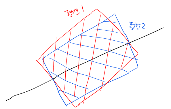 마찬가지로 나머지 선형 방정식들도 그리면 평면들이 됩니다. 만약 두 개의 평면이 만난다면, 만나는 부분은 직선이 됩니다. 두 개의 선이 만날 때, 하나의 점에서 만나는 것과는 다르죠.