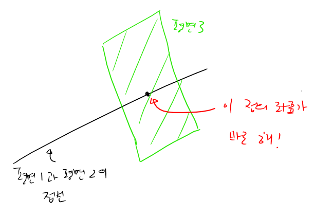 또 나머지 평면과 그 직선과 만나면 하나의 점에서 만나게 됩니다. 바로 그 점이 미지수가 3개, 방정식도 3개인 선형 시스템의 해가 됩니다.