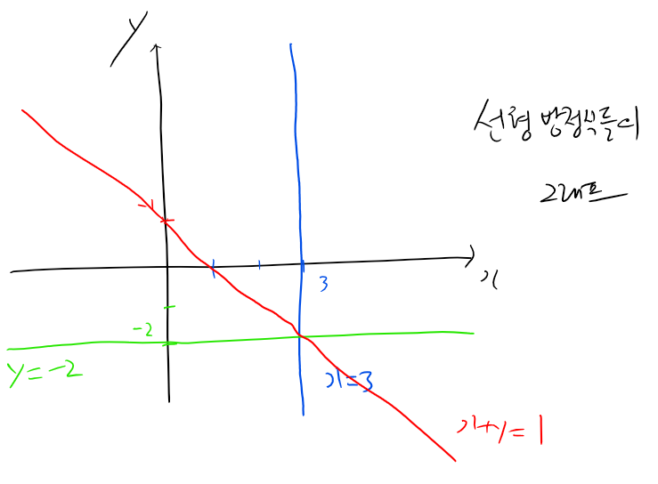 그러기 전에 먼저 선형 방정식이 무엇인지 집고 넘어가겠습니다. 선형 방정식은 쉽게 말해서 일차 방정식이라고 생각하시면 됩니다. x = 3, y = -2, x + y = 1과 같이 최고차항의 차수가 1이 넘어가지 않는 다항 방정식을 일차 방정식이라고 부릅니다. 반면 xy = 3, x^2 = 5, y = x^2 + 2x + 1 이런 것들은 2차 방정식입니다.
