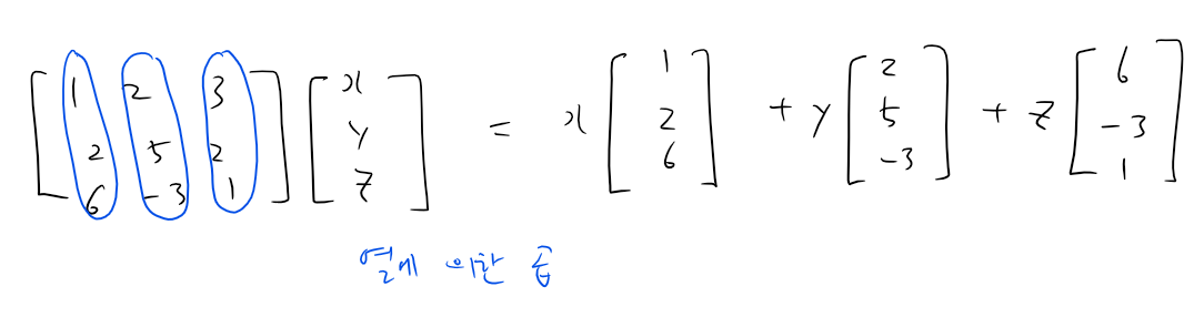 이 때 좌변의 Ax를 푸는 것도 두 가지로 생각할 수 있습니다. 1) row를 이용한 곱, 2) column을 이용한 곱.