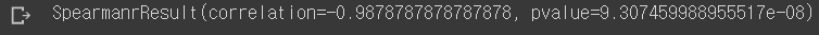 그러면 좀 더 정확하게 분석하기 위해 팀 순위와 팀 타율 간의 스피어만 상관계수(SROCC)를 계산해보겠습니다. 스피어만 상관계수는 두 변수 간의 단조 상관관계를 나타내는 지표입니다. 절대값이 1에 가까울수록 강한 상관관계를 갖는다고 보시면 됩니다. 저는 다음과 같은 파이썬 코드를 이용해서 스피어만 상관계수를 구해봤습니다. 파이썬 코딩 경험이 없으신 분들은 아래 결과만 보셔도 됩니다.