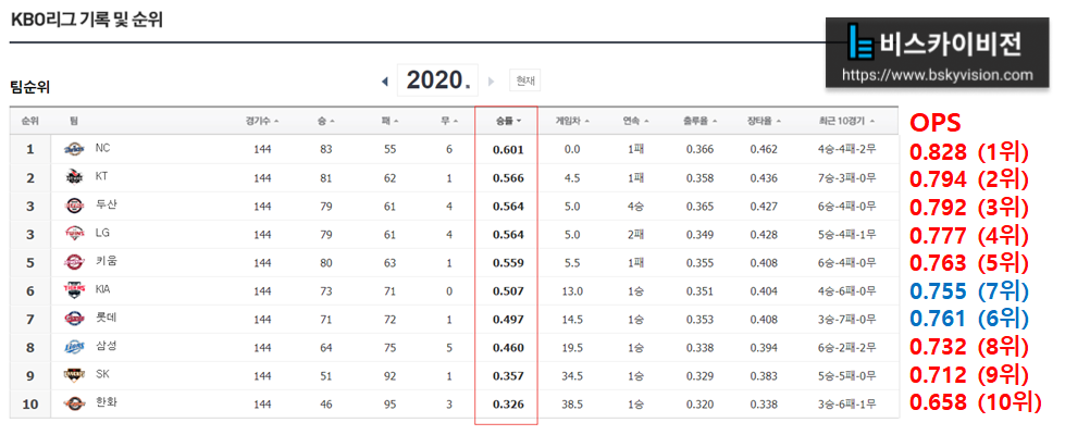 실제로 OPS가 높은 팀이 타율이 높은 팀보다 강한 팀인지, 저는 작년(2020년) KBO 리그의 정규시즌 데이터를 가지고 확인해보도록 하겠습니다.