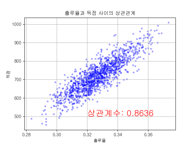 출루율과 득점 사이의 상관관계