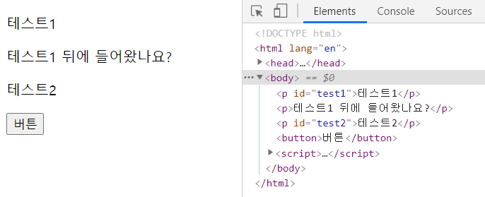 이번에는 button을 클릭하면 아이디가 test1인 요소 뒤에 새로운 요소가 들어가도록 코드를 짰습니다.