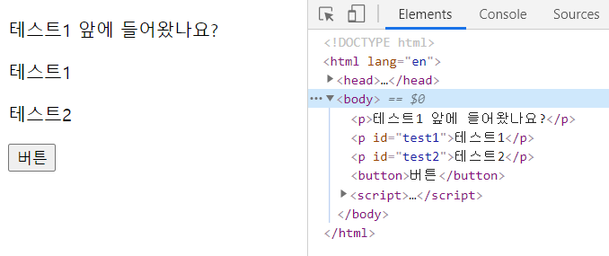 테스트1 앞에 새로운 문구가 추가되었음을 확인하실 수 있습니다. 오른쪽 개발자 도구 화면을 보시면 좀 더 명확하게 확인하실 수 있습니다.