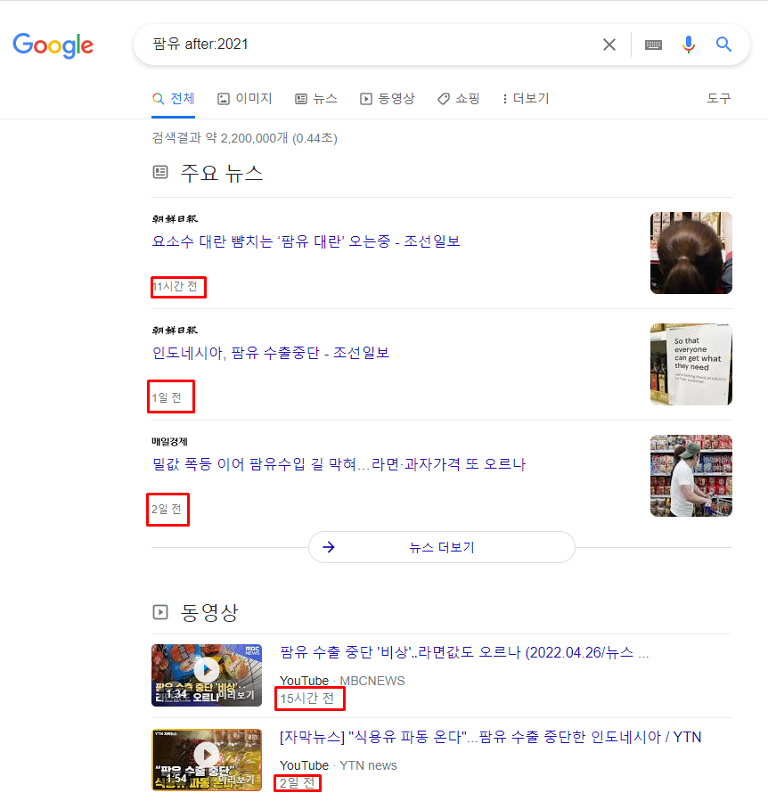 위와 같이 검색하면 2022년 이후에 쓰여진 "팜유"와 관련된 글만 검색됩니다. 2021년을 포함하지 않습니다. 코딩뿐만 아니라 주식과 관련된 정보를 검색할 때는 최신 뉴스를 보는 것이 생명이겠죠?