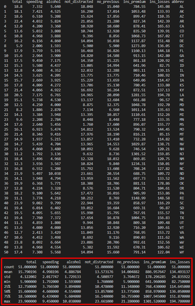 빨간색으로 강조한 부분이 describe() 메소드로 인해 출력된 데이터프레임 기술 통계 정보입니다. 각 컬럼의 count (데이터 개수), mean (평균), std (표준편차), min (최소값), 25% (제1사분위수), 50% (제2사분위수), 75% (제3사분위수), max (최대값)이 각각 출력된 것을 확인하실 수 있습니다.