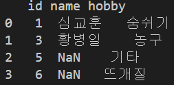 df2 = pd.DataFrame({'id':[1, 3, 5, 6], 'hobby':['숨쉬기', '농구', '기타', '뜨개질']})