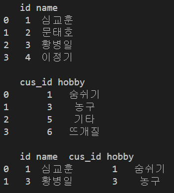df2 = pd.DataFrame({'cus_id':[1, 3, 5, 6], 'hobby':['숨쉬기', '농구', '기타', '뜨개질']})
