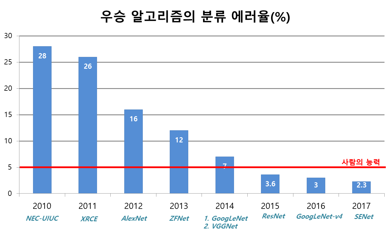 2010년, 2011년에 우승을 차지한 알고리즘들은 얕은 구조(shallow architecture)를 가진 것들이었다. 얕은 구조를 가진 알고리즘에서는 이미지 인식에 유용할만한 특성들을 개발자들이 임의로 결정해서 도출했다. 그러나 2012년 CNN 기반 딥러닝 알고리즘 AlexNet이 우승을 차지한 이후에는 깊은 구조(deep architecture)를 가진 알고리즘들이 우승을 차지했다. AlexNet은 약 26%였던 인식 오류율을 16%까지 낮췄다. 10%를 낮춘다는 것은 상상하기도 힘든 일이었다. 얕은 구조 기반 알고리즘들로는 0.1% 낮추는 것도 쉽지 않았기 때문이다.