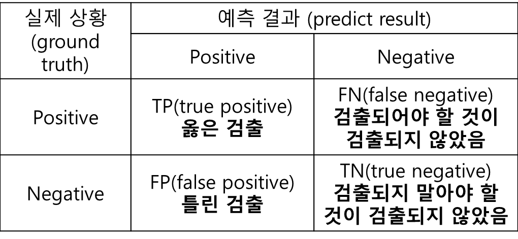 TP, FP, FN 그리고 설명하지 않은 TN(true negative)에 대해서 표로 정리해보았다.
