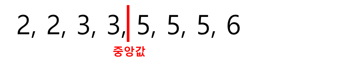 이 8개 숫자들의 중간은 3과 5의 사이라고 볼 수 있다. 따라서 이런 경우에 중앙값은 3과 5의 평균, 즉 (3 + 5)/2 = 4가 된다.