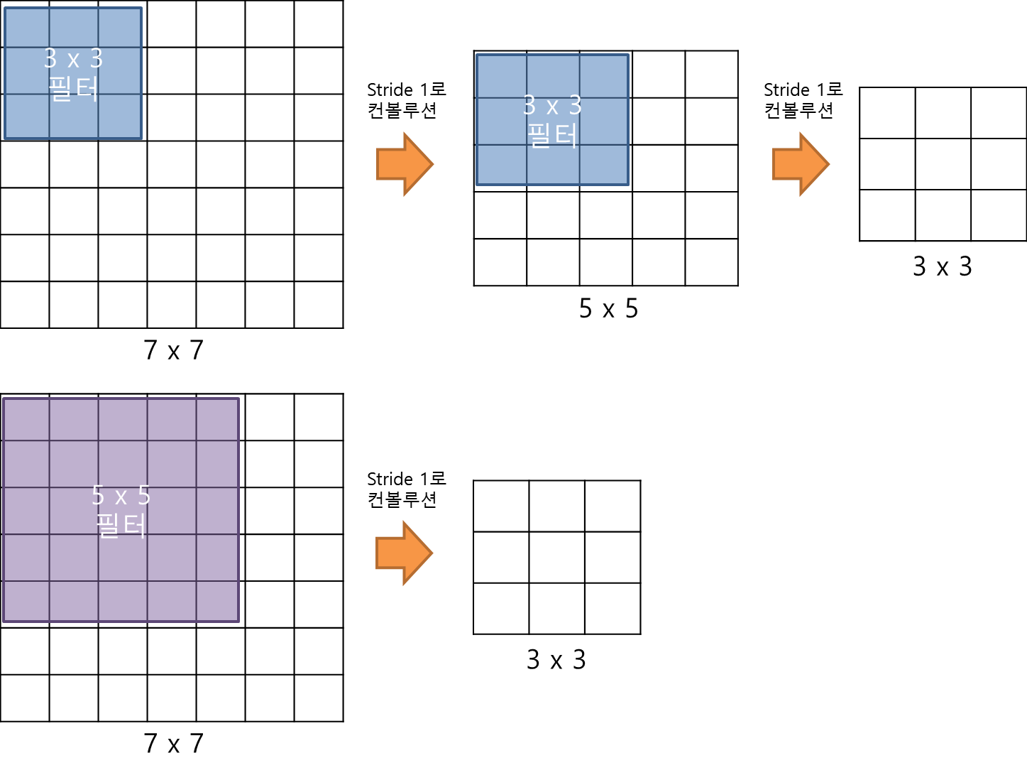 VGGNet의 구조를 깊이 들여다보기에 앞서 먼저 집고 넘어가야할 것이 있다. 그것은 바로 3 x 3 필터로 두 차례 컨볼루션을 하는 것과 5 x 5 필터로 한 번 컨볼루션을 하는 것이 결과적으로 동일한 사이즈의 특성맵을 산출한다는 것이다(아래 그림 참고). 3 x 3 필터로 세 차례 컨볼루션 하는 것은 7 x 7 필터로 한 번 컨볼루션 하는 것과 대응된다.