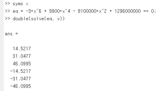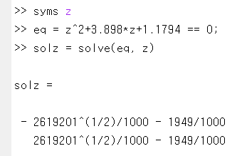 물론 그 유명한 근의 공식을 사용하면 누구든 풀 수 있습니다. 단지 오래 걸릴 뿐이죠. 대신 매트랩에게 맡겨보겠습니다.