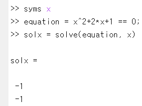 먼저 간단한 예를 들어보겠습니다. $x^2 + 2x + 1 = 0$ 의 해는 중근으로 -1임을 우리는 쉽게 알 수 있습니다. 이것을 매트랩을 구현하면, 아래와 같습니다.