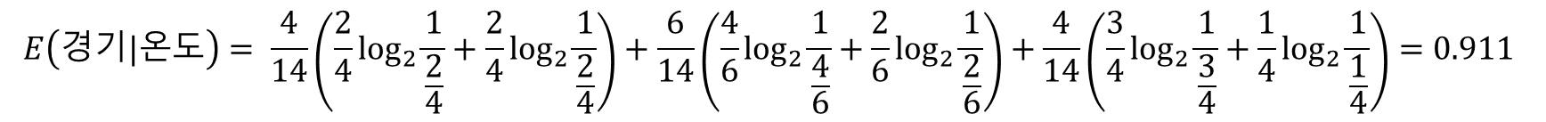 IG(경기, 온도) = E(경기) - E(경기|온도) = 0.94 - 0.911 = 0.029