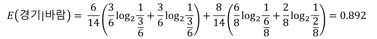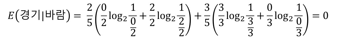 둘 중에서 E(경기|바람)이 0으로 더 작으므로, IG(경기, 바람)이 더 크다.