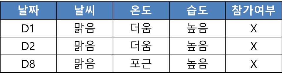 이제 습도를 상위 노드로 놓고 높음으로 갔을 때 하위 노드를 찾아줄 차례다. 날씨 맑음에 습도 높음만 고려해주면 된다.