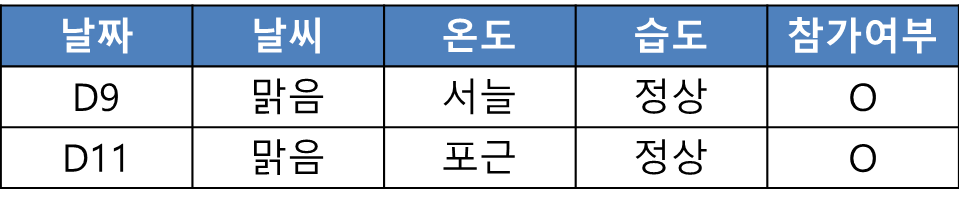 이번에는 습도를 상위 노드로 놓고 정상으로 갔을 때 하위 노드를 결정해보자. 날씨 맑음에 습도 정상인 날들만 고려하면 된다.