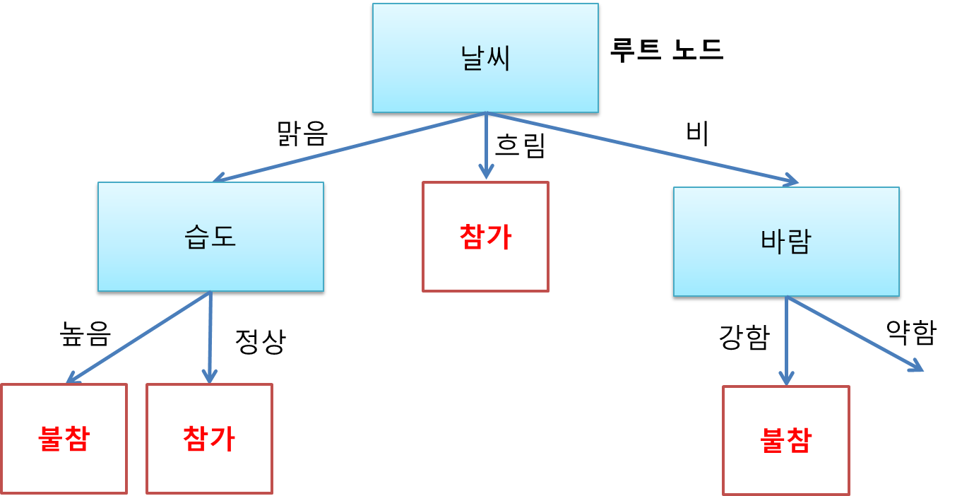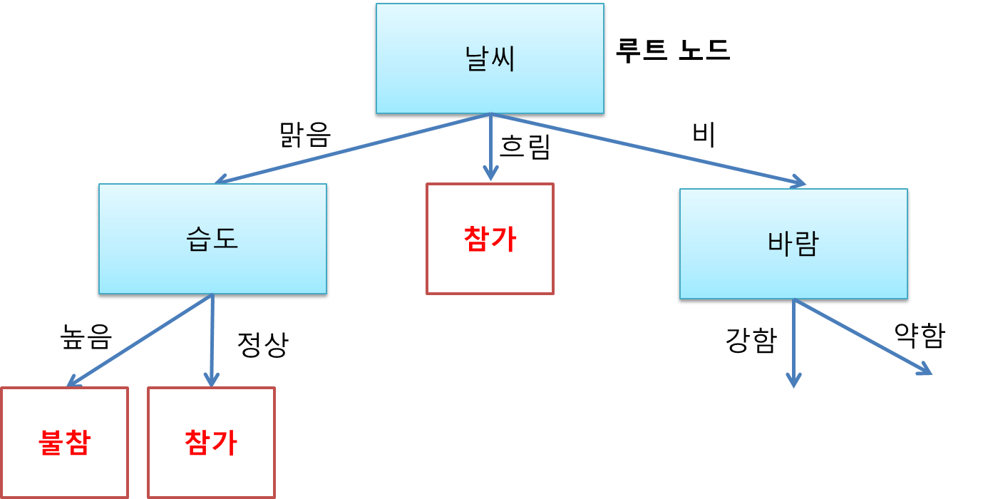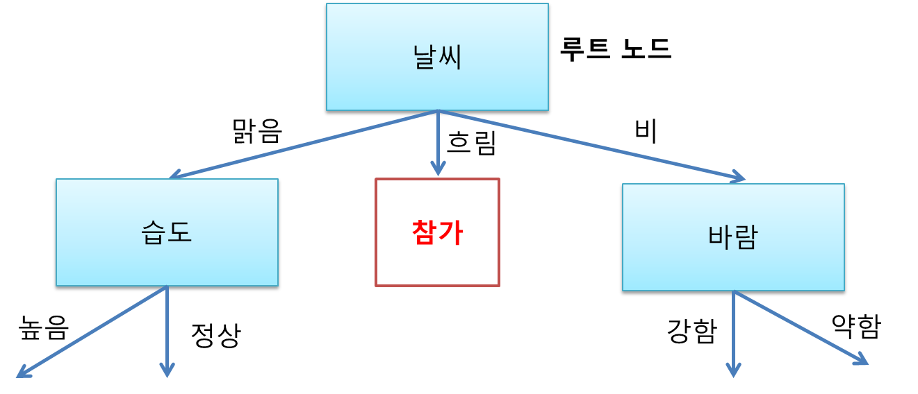 그런데 흐림인 경우에는 항상 참가임을 알 수 있다. 따라서 결정 노드가 아닌 참가 클래스가 붙은 리프 노드(leaf node, 잎 노드)가 아래에 붙는다.