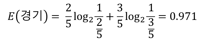 이때 목표 속성인 경기 참가의 엔트로피는 다음과 같다. 참가횟수가 3회이고 불참횟수가 2회이므로 참가할 확률은 3/5, 불참할 확률은 2/5이다.