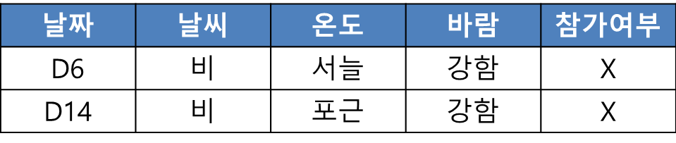 이번엔 날씨를 상위 노드의 속성으로 놓고 비로 갔을때 하위노드가 무엇이 될지 찾아보자. 마찬가지로 비인 경우만 생각하면 된다. 습도 속성은 이미 사용되었으므로 표에서 지웠다.