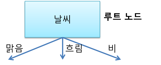 따라서 날씨를 결정 노드로 정해준다. 첫 결정 노드이므로 루트 노드(root node, 뿌리 노드)라고 명명한다.