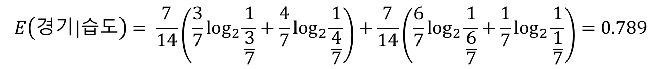IG(경기, 습도) = E(경기) - E(경기|습도) = 0.94 - 0.789 = 0.151