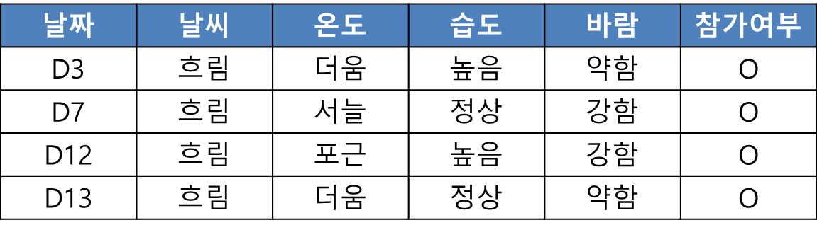 이제 날씨를 상위 노드의 속성으로 놓고 흐림으로 갔을때 하위노드가 무엇이 될지 찾아보자. 여기서는 흐림인 경우만 생각하면 된다.