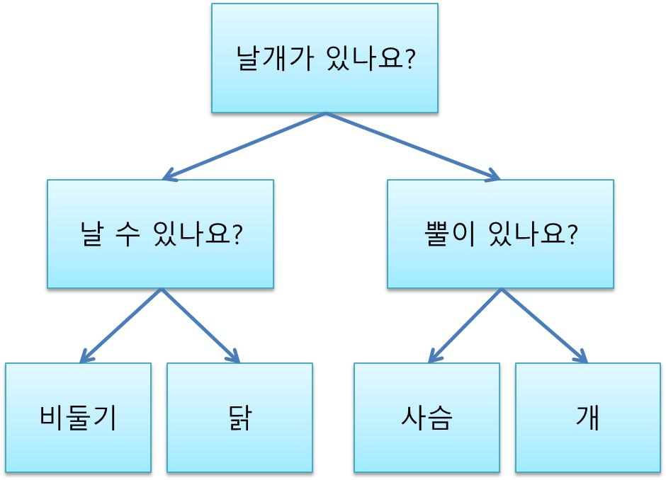 결정 트리는 스무고개 게임과 유사한 원리를 갖고 있다. 스무고개 게임은 답을 맞추기 위해 '예', '아니오'로 대답할 수 있는 질문을 최대 20번 할 수 있는 게임이다. 마찬가지로 결정 트리의 핵심도 질문이다. 질문을 통해 답을 찾아가는 것이다. 아래 그림을 보자.