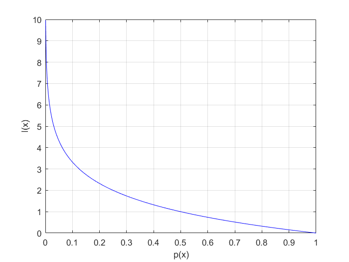 여기서 $p(x)$는 사건 $x$가 발생할 확률이다. 발생할 확률이 1에 가까울수록 정보량은 0에 가까워지고, 발생할 확률이 0에 가까울수록 정보량은 무한히 커진다. 아래 그래프를 보면 무슨 상황인지 확실히 이해가 될 것이다.
