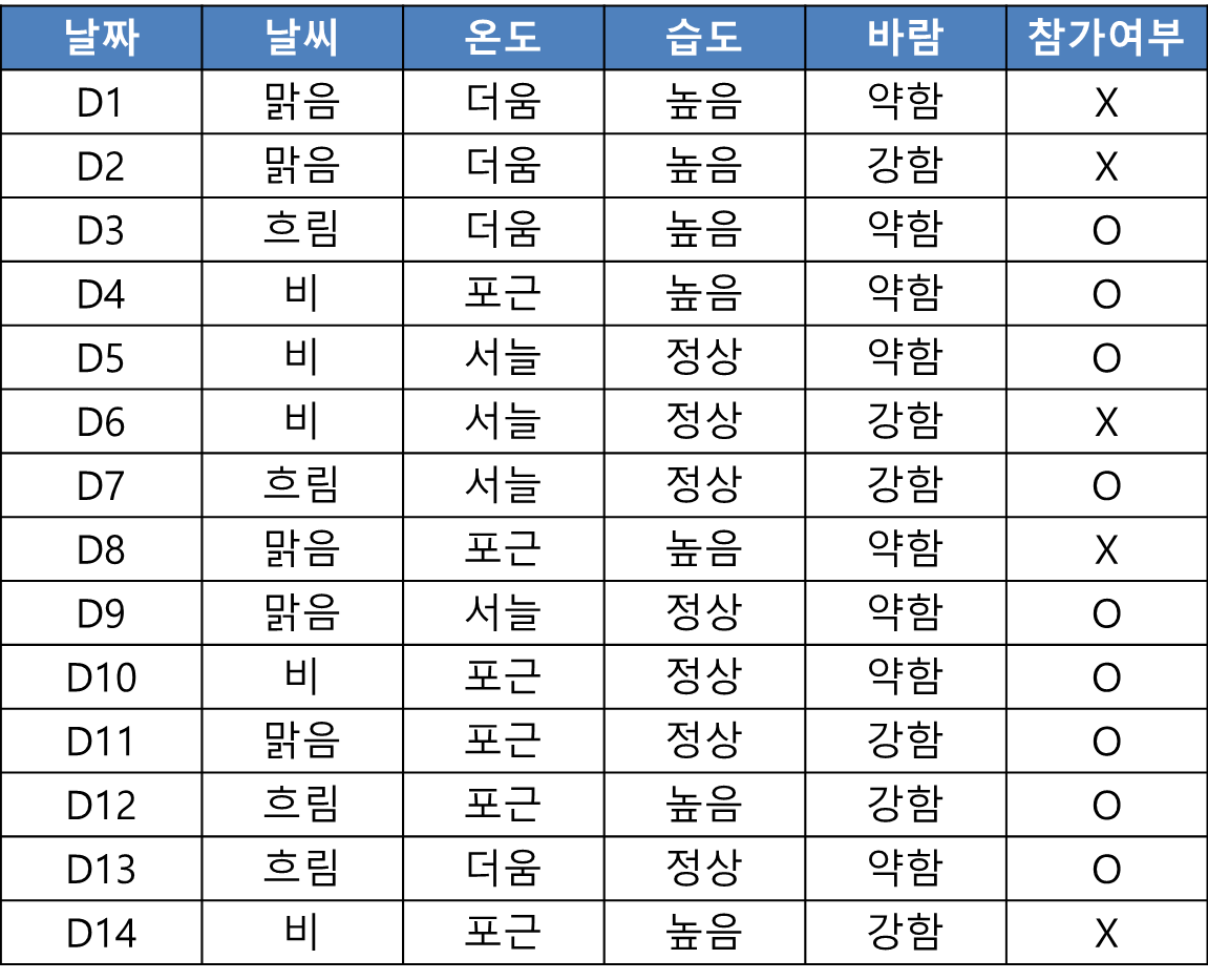여기서 A는 속성을 의미한다. 어떤 속성을 가지고 분류했을 때 가장 엔트로피가 작은지, 즉 정보획득량이 큰지를 알아내야한다. 이것이 무슨 말인지는 하나의 예제를 들어서 설명하도록 하겠다.