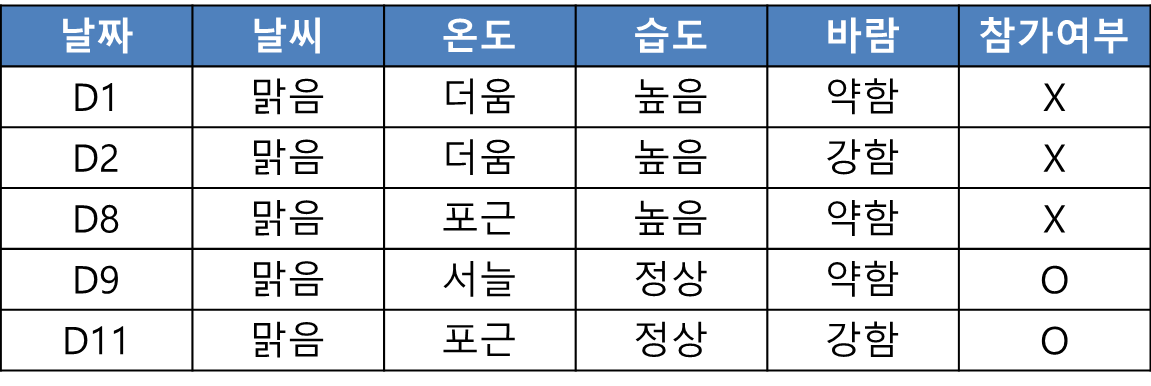 이제 날씨를 상위 노드의 속성으로 놓고 맑음으로 갔을때(속성값이 맑음일때) 하위노드가 무엇이 될지 찾아보자. 여기서는 맑음인 경우만 생각하면 된다.