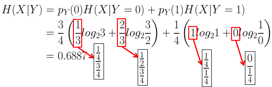 이번에는 조건부 엔트로피에 대해서 생각해보자. X가 주어졌을 때 Y의 엔트로피는 H(Y|X)로 표현하고, Y가 주어졌을 때 X의 엔트로피는 H(X|Y)로 표현한다. 위 확률분포표를 이용해서 두 조건부 엔트로피를 구해보자. 우선 조건부 엔트로피는 다음과 같은 공식으로 계산한다.