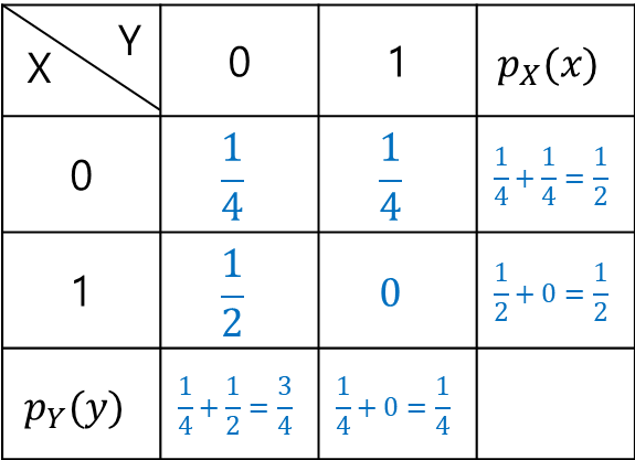 그러면 실제로 계산해보자. (x, y) = (0, 0)일 확률이 1/4이고, (x, y) = (0, 1)인 확률이 1/4이고, (x, y) = (1, 0)의 확률이 1/2이고, (x, y) = (1, 1)의 확률이 0이므로 다음과 같이 계산된다.