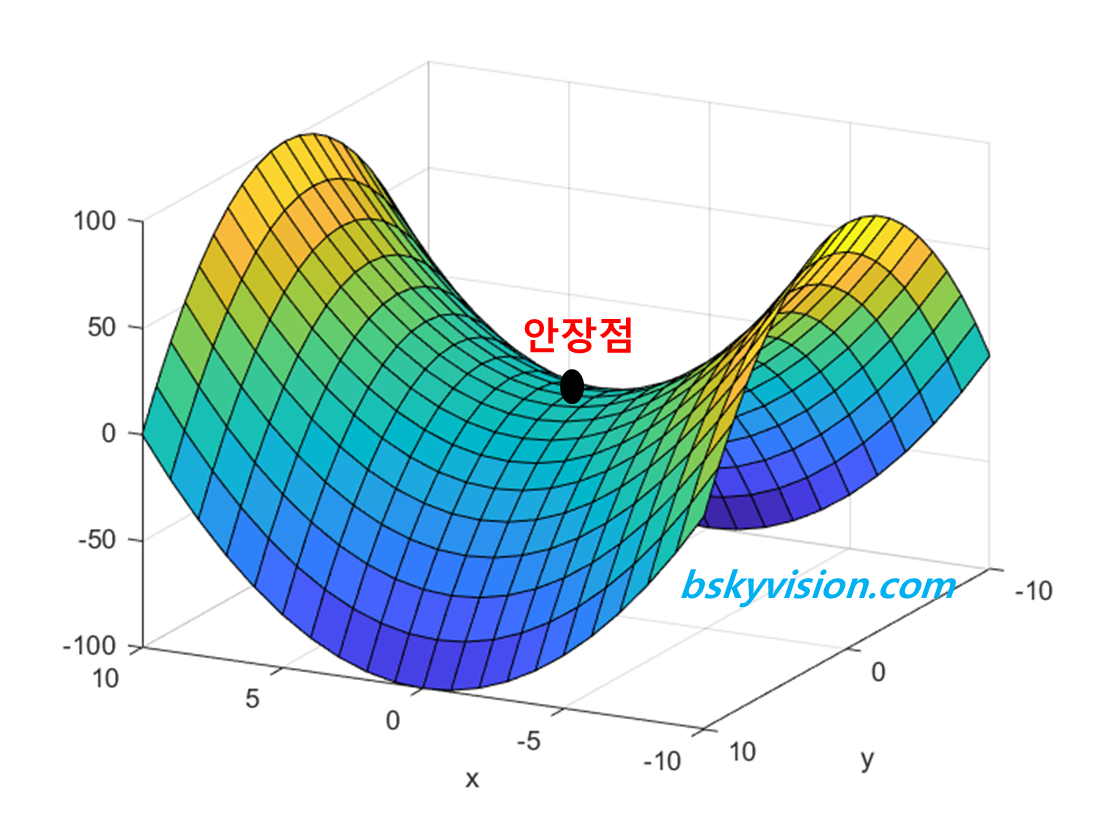 y축 방향에서 보면 극대점을 갖는 것처럼 보이는데 x축 방향에서 보면 극소점을 갖는 것처럼 보이죠? 말 안장 같이 생겼기 때문에 안장점이라는 말이 붙었습니다.