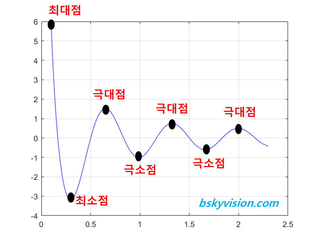 보시다시피, 최대점과 최소점은 하나씩만 존재하지만, 극대점과 극소점은 여러 개입니다. 이제 극소점, 극대점, 최소점, 최대점 충분히 이해되셨죠?