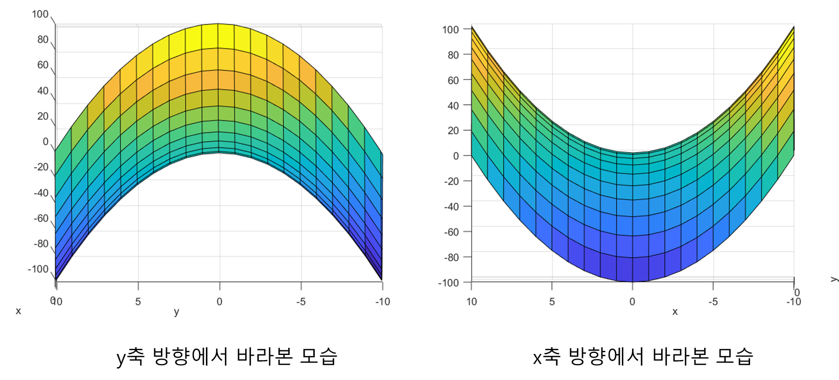 다음은 동일한 그래프를 y축 방향에서 바라본 모습과, x축 방향에서 바라본 모습입니다.