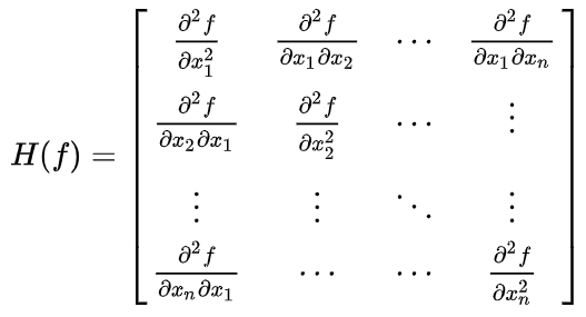 임계점이 함수의 도함수가 0이 되는 점들이라면, 그 임계점이 극대점, 극소점, 안장점인지는 어떻게 판정할 수 있을까요? 변수가 2개 이상인 다변수 함수의 경우에는 헤시안 행렬을 활용하면 됩니다. 변수 $x_1, x_2,..., x_n$을 가지는 다변수 함수의 헤시안 행렬은 다음과 같이 정의됩니다.