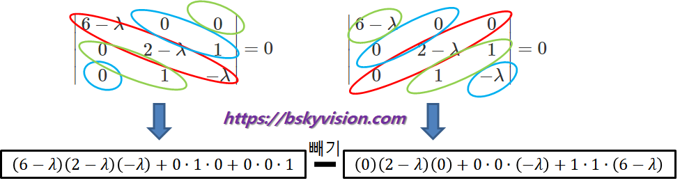 이 헤시안 행렬의 고유값들을 구하기 위해 $H -\lambda I$의 행렬식이 0이 되게 하는 $\lambda$들을 찾아줍니다. 고유값 구하는 것과 관련해서는 https://bskyvision.com/59를 참고하세요.