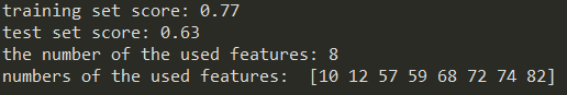 보시다시피 $\alpha$값을 낮추니 성능이 확 좋아졌죠? 그리고 0.01일 때 대략 최적인 것으로 보입니다. 주목할만한 것은 $\alpha$를 낮출수록 사용된 특성의 갯수가 늘어났다는 것입니다. 그만큼 복잡도가 높아진 것이죠. 또한 알파의 값이 0.1, 0.01, 0.001일 때 항상 사용된 특성을 살펴보면 57, 59, 72, 74, 82번 특성들이 있네요.