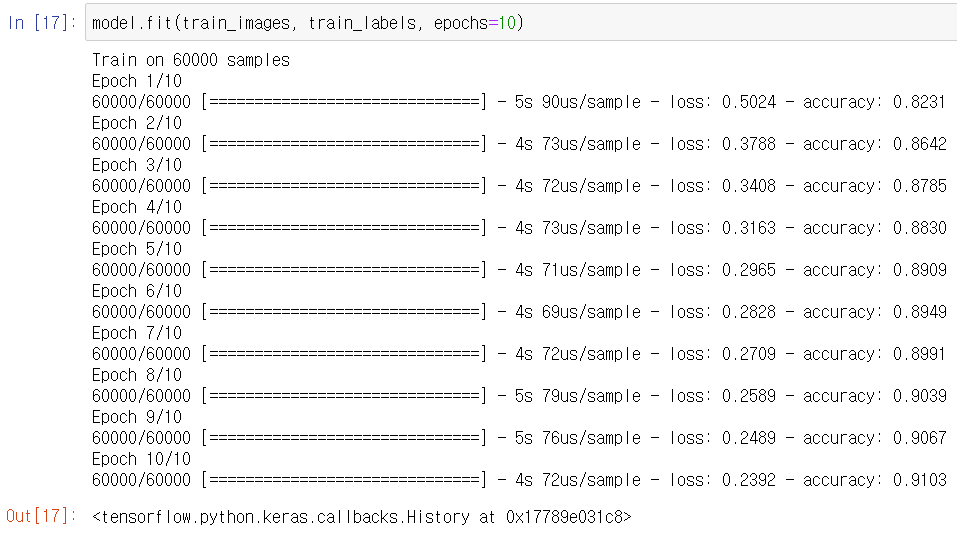 이제 훈련셋을 이용해서 모델을 훈련시킵니다. epoch를 10으로 설정했습니다.