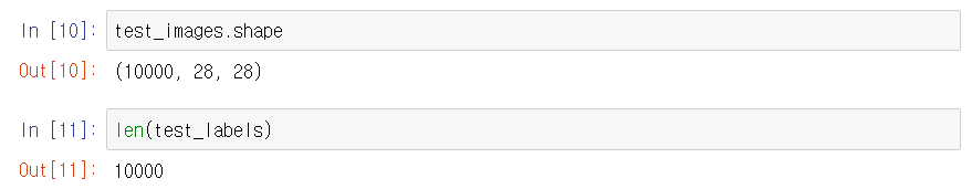 1만개의 테스트셋을 가지고 있고, 테스트 샘플들도 동일하게 28x28 사이즈의 이미지인 것을 알 수 있습니다.